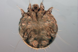 Die kreisförmigen Sarcoptes- oder Skabiesmilben sind nur etwa 0,2 bis 0,6 mm groß und damit mit bloßem Auge kaum zu erkennen.